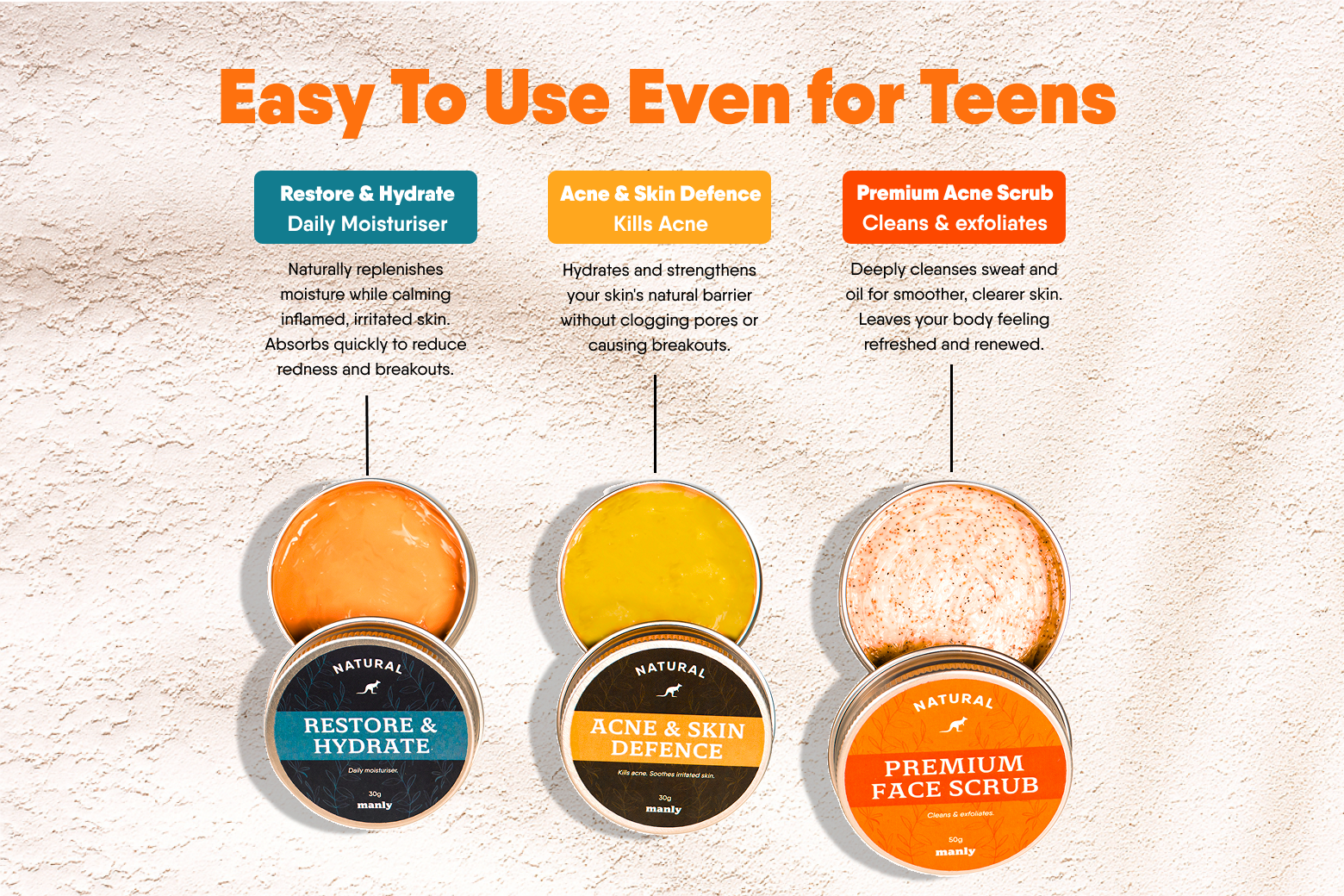 Manly’s 3-Step Acne System is purpose-built for men, using Australian botanicals like Thistle Oil and Sea Buckthorn Extract to calm inflammation, fight bacteria, and restore skin without over-drying.